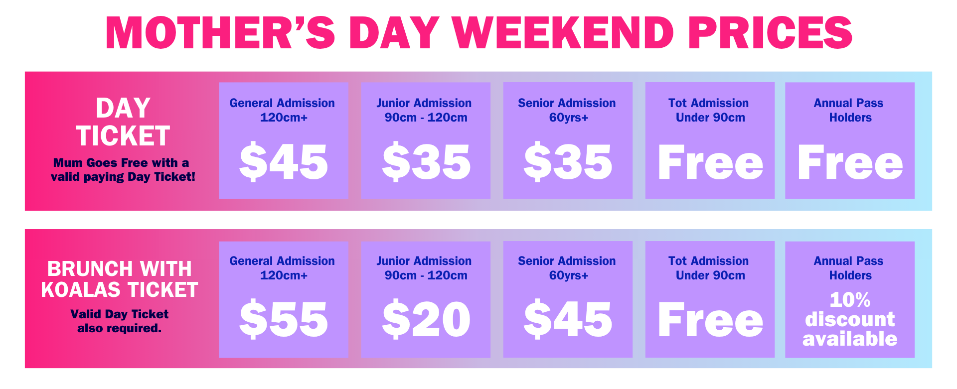 A Valid Day Ticket is required to book the Brunch with Koalas experience & all guests (including Mum) must purchase a Brunch Ticket.
